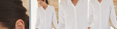 Stretch fabric for added comfort and fit. Requires minimal care, darts on back panel and on front from bottom hem to bust for fitted ladies' shape. 7 button placket with matching colour buttons, classic single button collar.