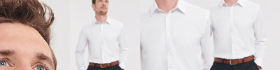 Long-sleeved Poplin shirt. Cotton/Elastane stretch fabric. Buttons in matching tones. Fitted. No pleat on back panel for optimal printing and embroidery. 2 spare buttons. 40° washable.